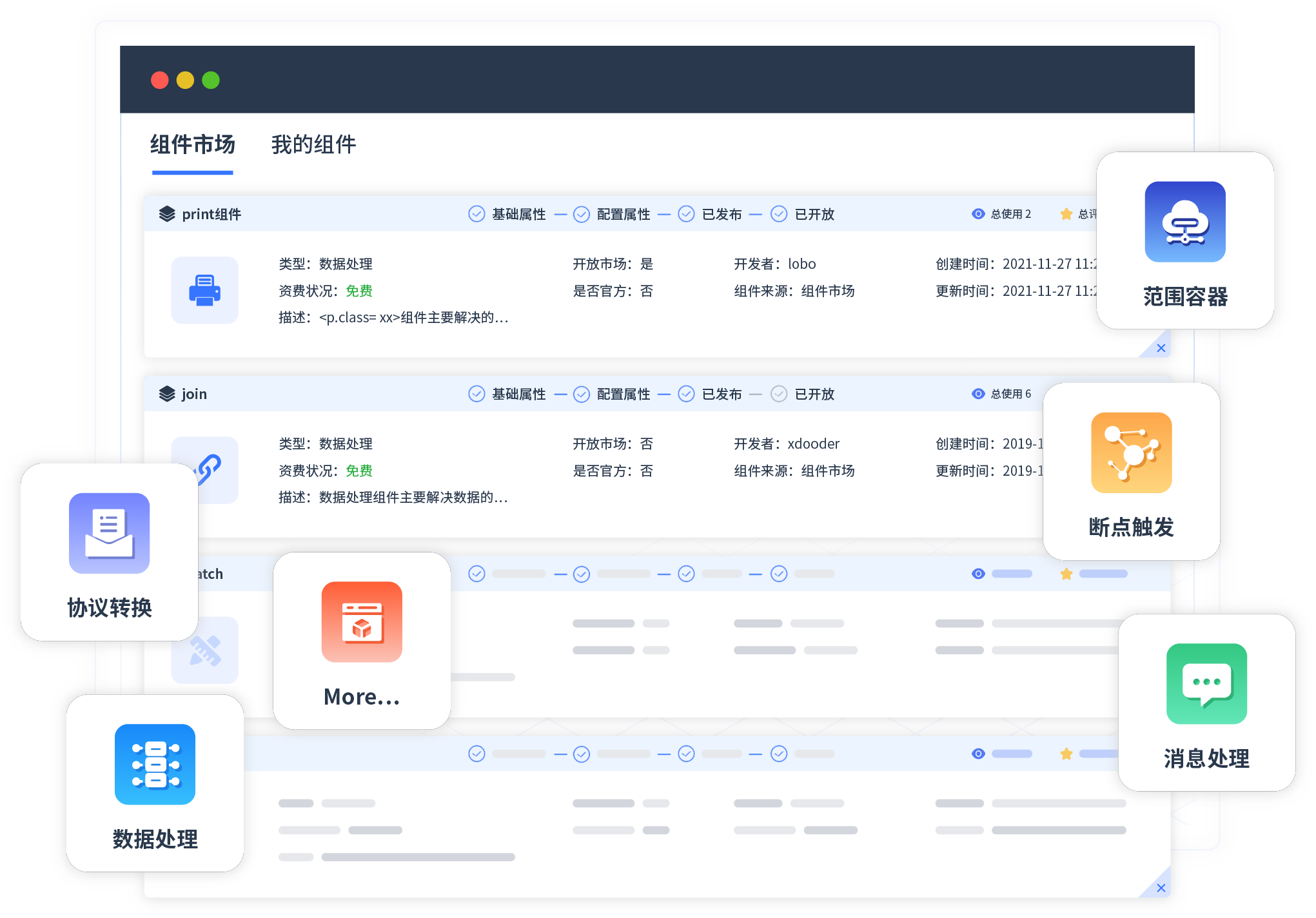 针对集成场景,,,沃钱包提供组件市场,,,,例如协议转换、、、、消息处理、、、文件操作等。。除平台提供的组件外,,客户可以自定义所需组件。。
